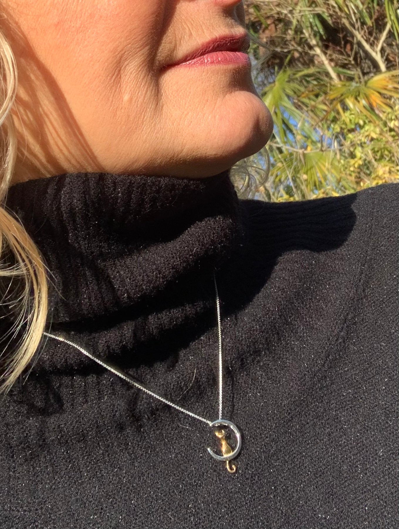 A beautiful Solid Silver Cat Necklet. 18ct Gold vermeil cat .Suspended on a 42cm strong silver box chain. Fitted with a 5cm extension chain.